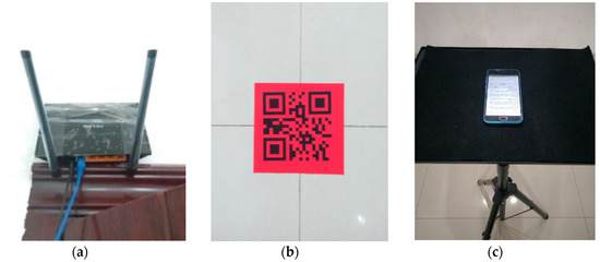 Experimental scenario of WLAN fingerprinting localization: (a) TP-LINK TL-WR845N AP; (b) 2-D code sticker on the ground; (c) Meizu M2 smartphone on a tripod.