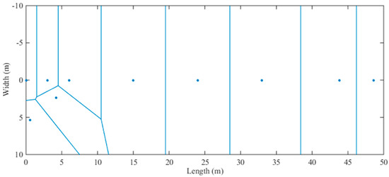 As mentioned above, we selected 10 CPs in the experimental environment, so the experimental environment is partitioned into 10 regions with a Voronoi diagram according to the locations of the CPs, with each region being a Voronoi cell. The partitioning result is shown in Figure 5, below. Because all of the CPs are in the corridor, most of the Voronoi cells in the straight corridor can be the standard rectangles, and it is easy for us to select the locations of IPs. In each Voronoi cell, we exploit the RSS data and location coordinates of CP to optimize the propagation model parameters between the CP and each AP.