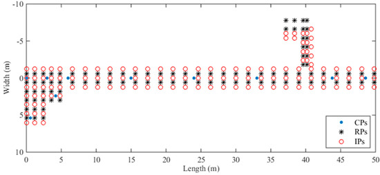 Then we select 128 specific locations in the experimental environment as IPs and estimate RSS data for these IPs. These IPs are around the RPs and CPs, and the locations of the CPs, RPs, and IP are shown in Figure 6. Specifically, the 128 IPs are distributed in the corridor and Room 620 like the RPs. We estimate the RSS data of different APs for these IPs with the optimized propagation model parameters in each Voronoi cell. Due to the influence of the experimental environment, before we compile these estimated RSS data into a new radio map for localization, we need to calibrate the estimated RSS data for IPs with the RSS data of the CP in the same Voronoi cell that can be collected in the real environment by crowdsourcing participants.