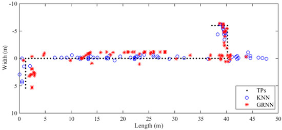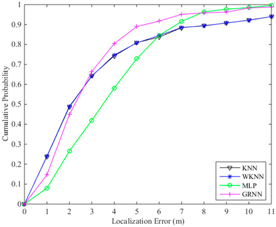 We also compute the localization results using all the RSS data at TPs and the fused radio map, and then compare the localization performance of the fingerprinting algorithms KNN, WKNN, MLP, and our proposed GRNN. We set the same parameters for the KNN, WKNN, and GRNN as in the simple trajectory experiment. Regarding the MLP we utilize, it is trained by the BP algorithm in the off-line stage. The numbers of neurons in the input layer, hidden layer, and output layer of the MLP are 7, 40, and 2, respectively. The number of iterative epochs is set to be equal to 10,000. Meanwhile, Sigmoid function and linear function are selected as the activation functions for the hidden layer and output layer of the MLP, respectively.