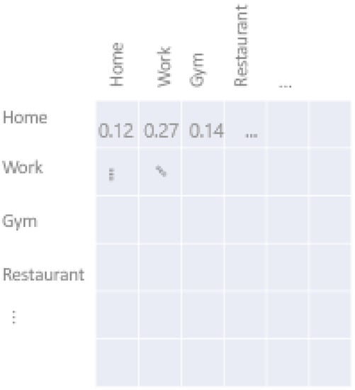 According to this matrix, there is a 27% chance for a user being at home to visit the gym next, while there is only a 12% chance to stay home. The transition matrix can refer either to a single user or to a set of users.