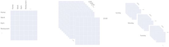 Figure 3 illustrates on the left an example of a location transition matrix as we had in Figure 2, while the middle and the right part elucidate vividly the multi-dimensionality of our model regarding time of day and day of week ( matrices).