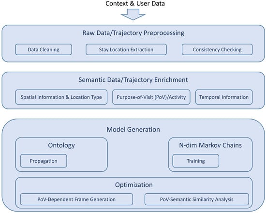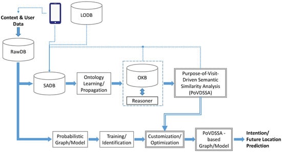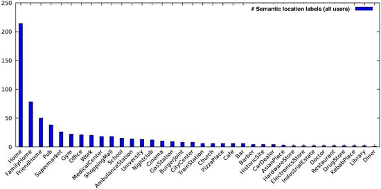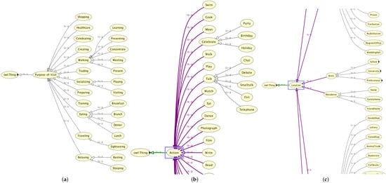Long et al. [25] proposed a location clustering algorithm, which uses the Latent Dirichlet Allocation method, a probabilistic model used normally to cluster documents based on the topics contained in them. They defined so-called geographic topics in an unsupervised manner from the check-ins at the corresponding venues of Foursquare (https://foursquare.com/) users based on their popularity. These topics replace static location categories such as the ones provided by Foursquare. Additionally, they investigated how location clusters behave depending on whether it is a weekday or weekend. In [26], Krishnamurthy et al. exploited Twitter (https://twitter.com) tweets to predict the location of its users. They introduced the concept of localness to express how “close” certain terms appearing in a tweet, so called local entities, are to particular cities. To this effect, they investigated several different measures, including two semantic relatedness measures, the Jaccard [27] and the Tversky [28] Indices. After determining the localness scores for each city of the corresponding local entities in the tweets of a user, it is possible to estimate the location of the user. Finally, Wannous et al. and Malki et al. proposed a multi-ontology based approach in combination with a set of rules created by a group of experts to model and reason about movement and activity patterns of marine mammals [29,30,31,32,33]. Their set of rules is subdivided into spatial, domain-specific and temporal rules respective each time to the applied ontologies.