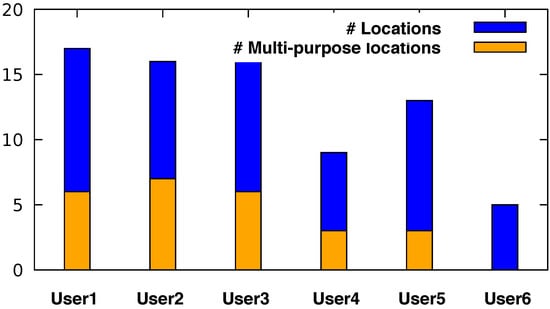 where and represent two different locations, refers to the common properties (e.g., purpose of visit, time and day) of the particular locations and gives the distinctive purposes that are associated only to the one location and do not appear in conjunction with the other. However, Equation (5) captures solely a single moment. That is, it actually describes the similarity between two particular stays and at locations and , respectively, only for a certain moment and not the overall location similarity. A stay refers here to a single visit of a certain location at a certain time (and day) for a certain reason. To calculate the overall semantic similarity between locations, we compute the average pairwise similarity of all existing stays at and , as shown in Equation (5). This reflects our definition of a Purpose-of-Visit-Driven Semantic Similarity (PoVDSS).