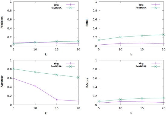 Figure 15 illustrates the performance of our PoVDSSA-based approach in comparison to Ying et al.’s framework over various k values with respect to (macro) accuracy, (macro) precision, (macro) recall and (macro) F-score.