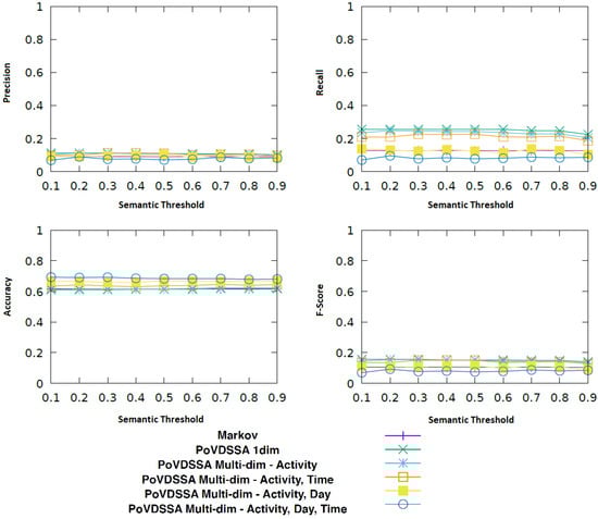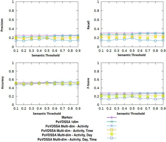 In this case, almost all of our PoVDSSA-based variants perform better than our baseline. Once again, the PoVDSSA 1-dim and the PoVDSSA Multi-dim-Activity outperform the rest, achieving an almost twice as high recall and F-Score value as the (multi-dimensional) Markov approach in Section 5. Furthermore, as before, the model that considers the most context information (PoVDSSA Multi-dim-Activity, Time, Day) shows the worst performance and lies with respect to precision, recall and F-Score below the Markov baseline. However, surprisingly, this time, in terms of accuracy, it provides, with almost , the highest results, a fact that at least indicates the importance and the added value in taking additional context information into account. It is also apparent in the figure that in this case the semantic similarity threshold plays a less significant role.