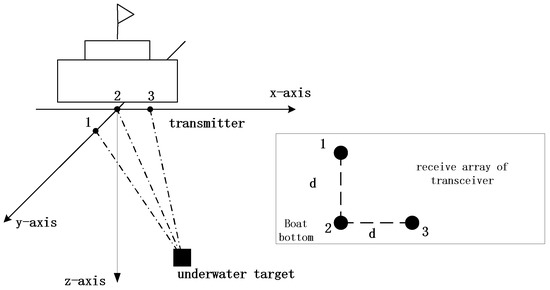 where is the center frequency of the received signal, is the speed of the sound, and λ is the wavelength corresponding to the frequency ; all quantities are measured by the underwater acoustic monitoring equipment. Using the USBL principle and geometry physics, the three-dimensional coordinates of the target are