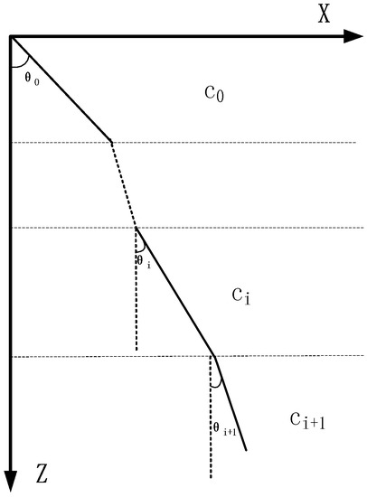 Assume that the sound beam propagates in an underwater area composed of n layers with different sound speeds. Also, assume that a sound wave propagates along a straight line at a constant velocity in one layer, while the sound speed in each layer is different. Then, the sound wave’s propagation trajectory can be subdivided into several straight lines [27], as shown in Figure 3. The path propagates in the ith layer beam is , the angle between the incident beam and the horizontal plane is , is the propagation speed of a sound wave in each layer, is the wave propagation time through the ith layer, and is the water layer thickness of the ith layer.