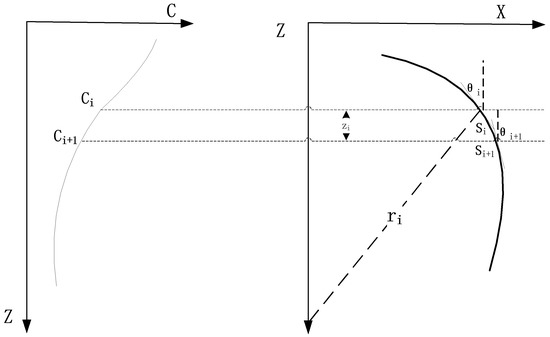 In the equal gradient ray tracing method, it is assumed that the relationship between the velocity of sound and the depth is linear, and the trajectory of a sound wave in each layer is considered as an arc segment with the radius [28], as shown in Figure 4. In Figure 4, is the path of the arc segment through the ith layer, and is the radius of the circle corresponding to the radius of the ith layer; P is the Snell constant which is defined by Equation (13).