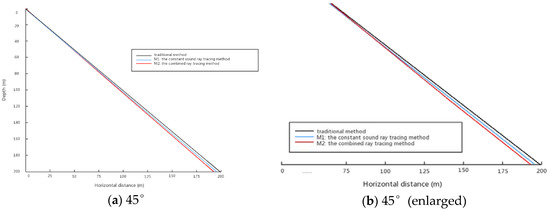 Figure 15 shows the simulated sound ray tracing model at 45°. It can be seen that the sound ray tracing model under the traditional method is completely a straight line. At the beginning of the constant sound ray tracing method and the combined ray tracing method, the sound ray tracing almost overlaps, but gradually becomes curved later.