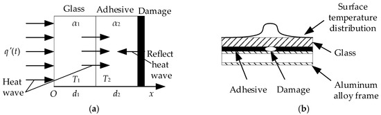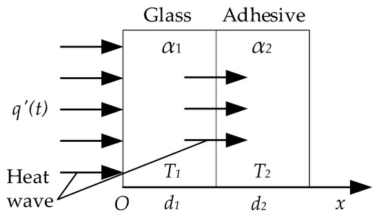 MFI radiation is mostly absorbed by the surface of the glass when it irradiates on the glass curtain wall, causing the temperature rising of the glass surface. Then, heat transfers to the interior of the glass in the form of direct thermal wave. The glass curtain wall can be approximated as an infinitely large multi-layer board without an internal heat source. In the thermal wave testing for adhesive bonded structure of glass curtain wall, the propagation of heat wave in adhesive bonded structure of glass curtain wall can be regarded as a one-dimensional unsteady heat conduction without inner heat source (Figure 1). The differential equations of one-dimensional unsteady heat conduction are shown in Equation (3):