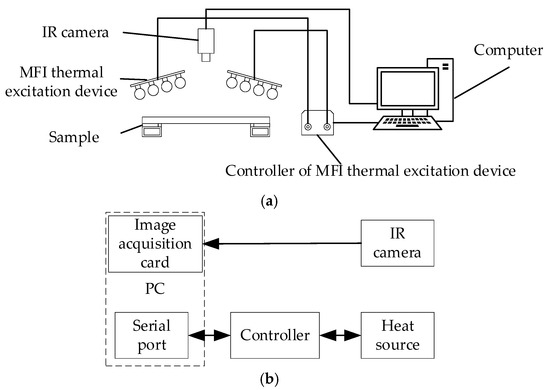 According to the selection of the thermal excitation function and the radiation device, the active thermal sensing platform for adhesive bonded structure damage detection is set up, as shown in Figure 3a, and framework of the platform is shown in Figure 3b.