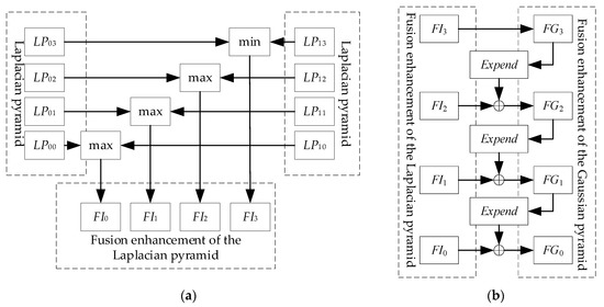 The process of the fusion enhancement. (a) The process of Laplacian pyramid; (b) the process of Gaussian pyramid.