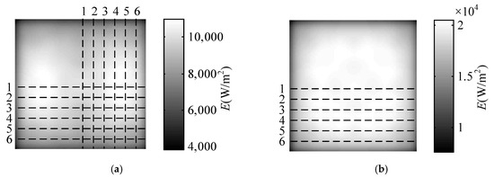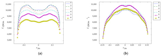 The irradiance distributions in transverse and longitudinal direction forms an approximate complementary relationship. Therefore, four carbon fiber radiators are arranged in a square shape, called cross-optimization arrangement, and the optimization results are shown in Figure 8b. Six sampling lines of Figure 8b are taken to get the irradiance distribution of the sample lines, as shown in Figure 10.
