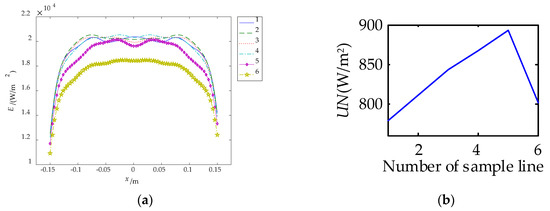 The uniformity after cross optimization arrangement is 2310 W/m2. Considering four carbon fiber radiators, the uniformity of two carbon fiber radiators is 1155 W/m2, which is 17.50% higher than the design value. As shown in Figure 10a, the irradiance of the sample line after cross-optimization become more uniform. The irradiance distribution of sample line 1 to line 4 are approximately uniform, which therefore can be taken as detection area.