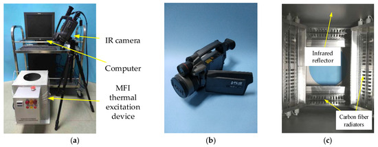 Active thermal sensing platform of glass curtain wall bonding structure damage detection. (a) Complete platform; (b) thermal imager; (c) crossed distribution of carbon fiber radiators.