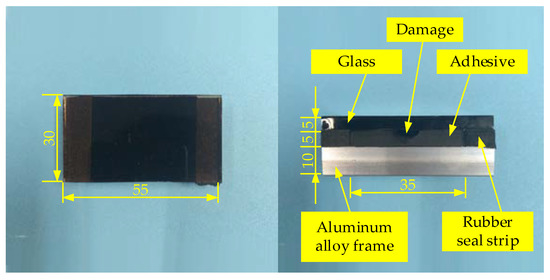 An active thermal sensing platform of adhesive bonded structure damage detection of glass curtain wall was built, as shown in Figure 11. The platform is composed of the MFI thermal excitation device, FLIR SC660 IR camera and PC. The MFI thermal excitation device heats the sample and raises the surface temperature of the glass. Thermal IR camera collects the irradiance of the glass surface periodically, and reconstructs the surface temperature in the form of thermal image sequence. Finally, Fusion enhancement algorithm is used to highlight the damage. Figure 11c shows the distributions of carbon fiber radiators. The crossed arrangement can offer a uniform irradiance in central region. The infrared reflector is produced by sand-blasting process of quartz sand on the inner surface to form uniform diffuse reflection of the thermal excitation. The actual size of the curtain wall glass is great. To meet the requirements of laboratory research, glass curtain wall samples in a size 30 × 55 mm are produced, as shown in Figure 12.