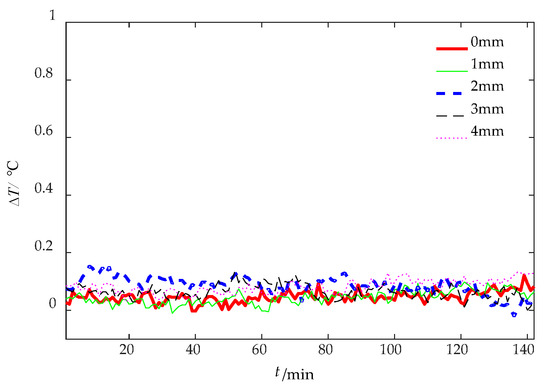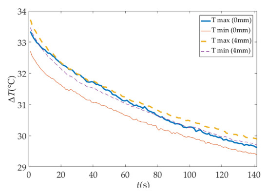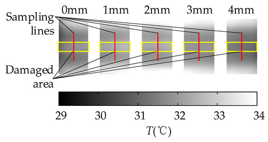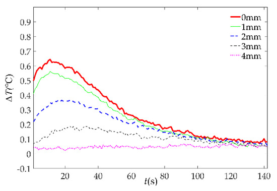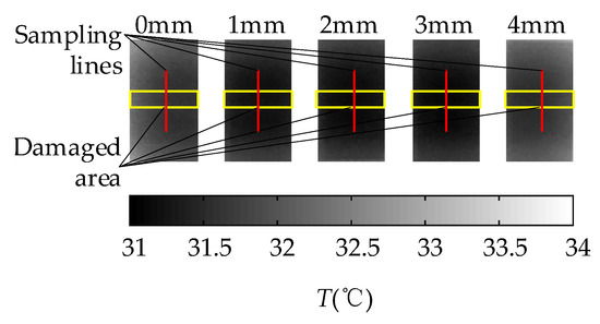 In the experiment of the MFI thermal excitation, the thermal excitation time was 20 s and then the MFI thermal excitation device was removed. The sampling rate of the IR camera was 1 frame per second and the sampling time was 142 s. The thermal image of 30 s is shown in Figure 16. The defects can be distinguished on the thermal image, for the differences in gray scale at defects are apparent. With the depth of damages increases, the color of the damaged area becomes darker and the contrast between damaged area and non-damaged area becomes smaller. But the effect of deep defect (more than 4 mm) is not obvious. The maximum and minimum temperature of the 0 mm and 4 mm depth damaged are showed in Figure 17. The curves of surface temperature difference between damaged area and non-damaged area are shown in Figure 18. The surface temperature differences are in the range of 0.02 °C to 0.64 °C. The curve of 0 mm increases to the apex and decreases in higher rates compared with the deeper damages. The maximum temperature difference appears near 15 s. Therefore, the temperature difference of 15 s can be used as an index to measure damage. The relationships between the surface temperature difference curves and the depth of damages location are shown in Figure 19. The maximum value of the temperature difference has an approximate linear relationship with the depth of the damage location. The maximum temperature difference of 0 mm is 0.64 °C while the 4 mm is smaller than 0.1 °C. With the depth of damages location increasing, the time of the maximum value of the temperature difference is delayed, and the maximum value is lower.