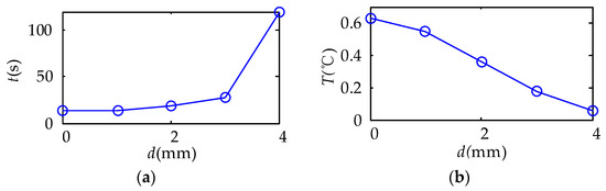The relationships between the surface temperature difference curves and the depth of damages location. (a) The relationships between time of maximum surface temperature difference and the depth of damages location; (b) the relationships between maximum surface temperature difference and the depth of damages location.
