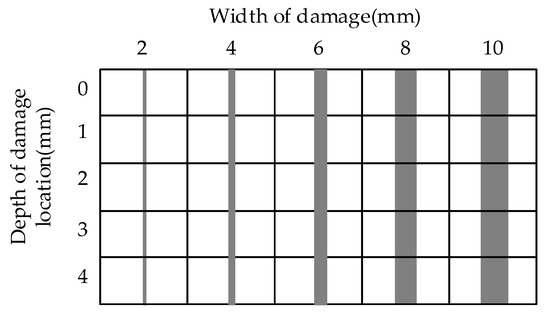 In the fusion enhancement, the more the Laplacian pyramid decomposition layers of the thermal image are, the more thorough separation of detail and shape will be got, and the finer the detail distinction is. Taking the speed of fusion enhancement processing into account, the thermal image is decomposed into four layers in this paper. To speed up the progress of the experiment, the distribution of samples is shown in Figure 20. Each small rectangle represents a sample and the gray area in the rectangle indicates the damage position. The depths of damages are 0 mm, 1 mm, 2 mm, 3 mm and 4 mm, and the widths of damages are 2 mm, 4 mm, 6 mm, 8 mm and 10 mm.