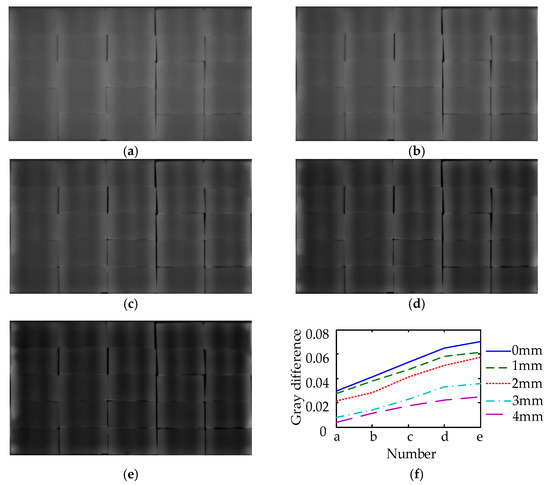 In quantitative analysis of the enhancement effect of the fusion enhancement, the gray differences of damages which is 6 mm in width were taken as examples to obtain the relationship between the number of gray linear transformation and the gray difference. Five relationship curves of different damage depths are shown in Figure 21f. With the time interval of the two thermal images increasing, the gray difference also increases. Comparing the curves of different depths, the increased value of the gray scale differences is similar. For example, the gray differences of the damages at 0 mm depth increases from 0.029 to 0.070 and the growth value is 0.040, while the gray differences of the damages at 4 mm depth increases from 0.004 to 0.025 and the growth value is 0.021.