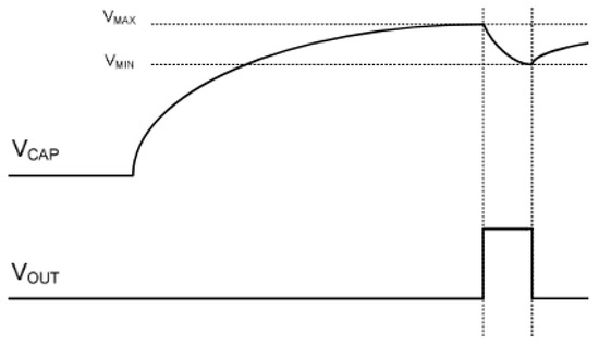 The timing diagram of capacitor charging. The sensor activates when the capacitor voltage reaches and keeps operating until the voltage drops to [6].
