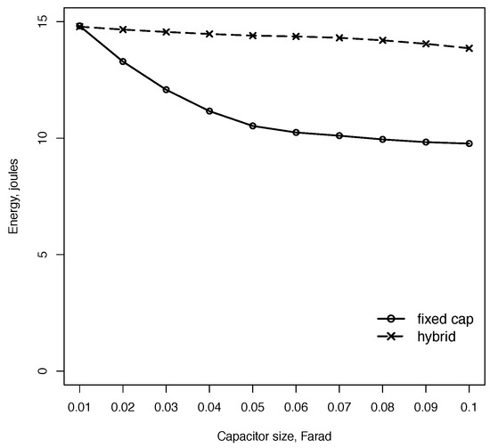 The first experiment demonstrates the impact of capacitor size on the total usable harvested energy. The hybrid configuration combined a small 10-mF capacitor with a larger capacitor in the 10–100 mF range. Figure 4 demonstrates that increasing the capacitor size from 10 mF to 100 mF reduces the amount of usable harvested energy by 40%. The hybrid approach in contrast shows consistent performance for various capacitor sizes. The usable harvested energy reduces slightly due to the time needed for an initial capacitor charge when the node switches to a large capacitor near a home station.