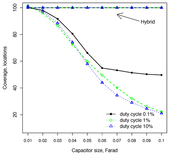 In this experiment, we measure sensor coverage, i.e., a proportion of unique locations where a sensor was able to boot and execute a task, i.e., represents a geographical coverage. The task run by a sensor node can be supported by a small 10-mF capacitor. For a fixed capacitor configuration, the coverage depends on the duty cycle, as shown in Figure 5, with maximum coverage achieved by the lowest duty cycle. Increasing the fixed capacitor size from 10 mF to 100 mF reduces the coverage by 42% at 0.1% duty cycle. Stepping up the duty cycle to 1% further reduces coverage by up to 80% compared to the 10-mF configuration. However, increasing the duty cycle beyond 1% does not have a significant effect on the coverage. The hybrid configuration provides a consistent near 100% coverage at all capacitor sizes. In hybrid configuration, the node boots on a small capacitor, which enables it to boot at all locations. The performance of hybrid configuration does not depend on the larger capacitor size, as it performs the switch only when the available energy is sufficient to charge the larger capacitor.
