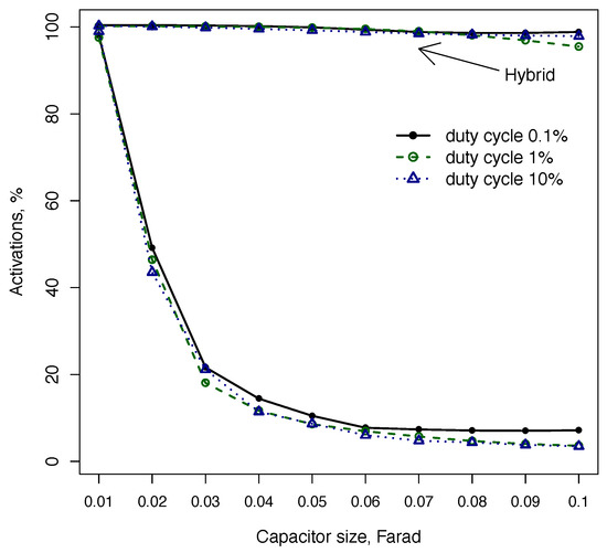 Finally, Figure 6 shows sensor activations defined as the proportion of all (non-unique) locations where a node was able to boot and execute a task. In other words, multiple visits to the same location are counted as separate activations. This represents sensing applications, where the node needs to maximise the total amount of collected data irrespective of locations. It can be seen that a capacitor size has a drastic effect on sensor activations, reducing it by up to 90%. The hybrid configuration is not affected by a capacitor size and consistently achieves 100% activations. The number of sensor activations for hybrid configuration does not depend on the larger capacitor size, as it performs the switch only when the available energy is sufficient to charge the larger capacitor.