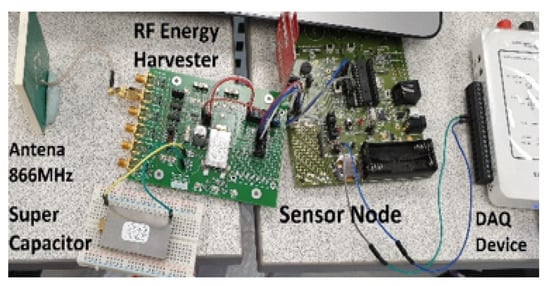 To validate the proposed design experimentally, a hybrid RF node design has been implemented based on the PowerCast P21XXCSR-EVB RF Energy Harvesting development kit (Powercast, Pittsburgh, PA, USA), which can harvest energy from six frequency bands and store energy in a built-in 50-mF capacitor or an external capacitor, connected through an extension port; see Figure 7. The 868-MHz ISM band has been selected as it has 865.6–867.6 MHz sub-band, which allows 3-W EIRP transmission in the UK [6]. The 868-MHz RF charging signal has been generated by a Rohde&Schwarz SMC 100 (Rohde&Schwarz, Munich, Germany) A signal generator with an AML 32210 Amp and a 6-dBi transmitting antenna. The board harvests energy from −15 to 15 dBm, provides three output voltage levels of 3.3 V, 4.1 V and 4.2 V and delivers up to 50 mA. With this setup, the board can harvest the energy from a 3-W 866-MHz source at a distance of 11 m. The purpose of this section is to demonstrate that the concept is practical and can be implemented using off-the-shelf hardware with minimum costs rather than reproducing and comparing with large-scale simulation experiments. This is because deployment and measurements within an RF energy harvesting environment over a large geographical area would be extremely challenging in terms of resources and logistics. Developing a case study, where RF energy harvesting platform is used for a real application, and reporting the results are potential future work.
