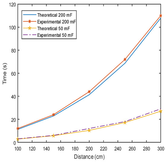 The charging time duration for 50-mF and 200-mF supercapacitors increases exponentially with charging distance. Practical applications that require longer charging range would thus require a very small capacitor.