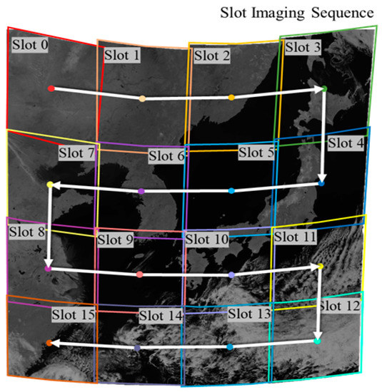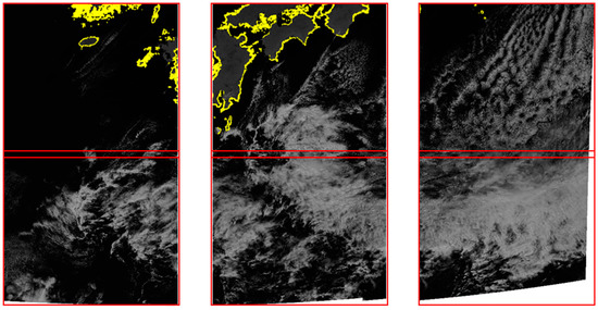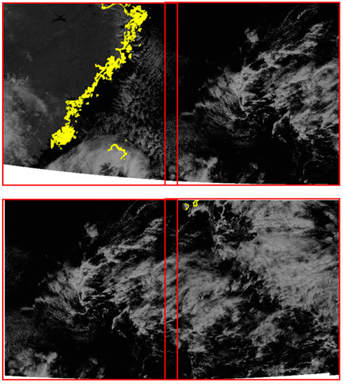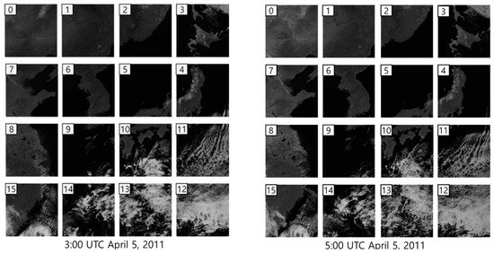 We used eight GOCI Level 1A datasets, which were photographed from 00:00 to 07:00 UTC 5 April 2011, for the experiments. Figure 9 shows examples of 16 GOCI slots in the NIR band.