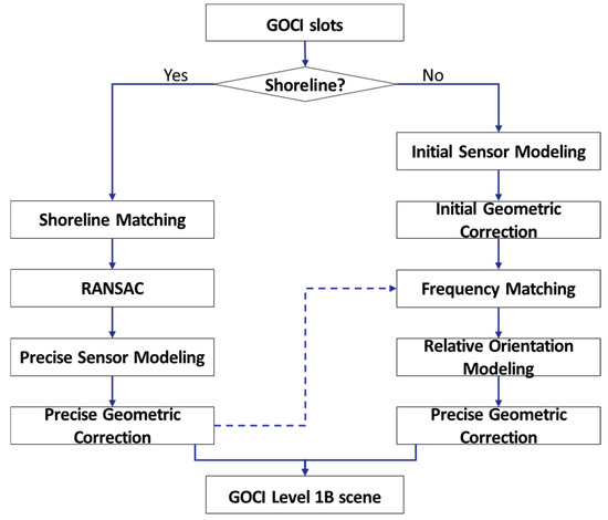 In the proposed method, all slots without shorelines undergo initial sensor modeling and initial geometric correction. Through these, distortions due to Earth’s curvature can be removed.