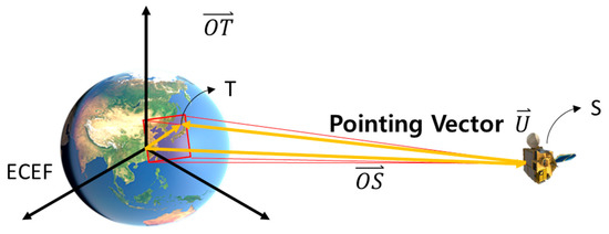 Each image pixel generates a pointing vector, , from the sensor (S) to a ground point (T). The relation between the sensor position (), ground point vector (), and pointing vector can be expressed as