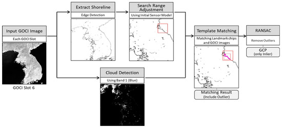For shoreline matching, we use GOCI near infrared (NIR) band images. This is because reflectance differences between water and land are largest in the NIR band, leading to best edge detection. The overall process of shoreline matching is as follows (Figure 4). Firstly, we extract the shoreline from GOCI slots through edge detection. We also construct shoreline chips by projecting a shoreline database into the GOCI image geometry using the GOCI initial sensor model. Secondly, using the initial sensor model, we adjust the search region to reduce outliers and improving matching speed. The center of the search region is calculated by the initial sensor model, and by considering the error range of the initial sensor model, the search region is set as 75 × 75 pixels. On the other hand, in order to prevent outliers in the areas occluded by thick clouds, we detect thick cloud using reflectance of the GOCI blue band [12]. If the detected cloud within the search range is over 20%, we skip the matching. If not, we conduct matching between shoreline chips and the edge-filtered GOCI NIR band. Through the matched results, we obtain image coordinates corresponding to ground coordinates of shoreline chips. These matching results may include outliers, and we remove them using random sample consensus (RANSAC) [13]. Finally, we use these matched results without outliers as GCPs.