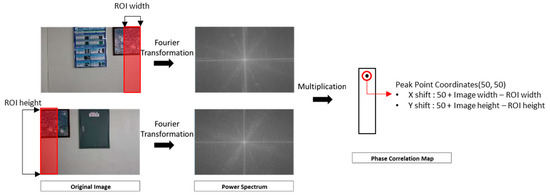 Two images are converted to frequency power spectrums through Fourier transformation. The two power spectrums are then multiplied to produce a phase correlation map. In a phase correlation map, values indicate the correlation between two images, and the positions represent the amount of shift between two images. For matching two images, the shift between them is determined using the position of the peak point in the phase correlation map. Figure 5 shows an example of the frequency matching process. In the example, the position of the peak value in the correlation map is (50, 50), and the relative shift can be calculated using these coordinates, the size of the image, and the region of interest (ROI).