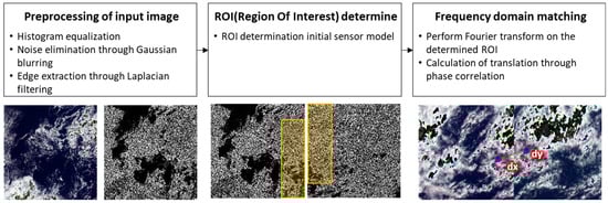 Estimation of the relative orientation between two images requires tie-points (image points of common features observable in both images). Tie-points are commonly extracted from feature points, which can be detected by algorithms such as Scale Invariant Feature Transform (SIFT), Speeded Up Robust Features (SURF), and Oriented FAST and Rotated BRIEF (ORB) are commonly used to extract tie-points based on feature points [3,4,5]. However, the feature-based tie-point extraction method cannot be applied to the GOCI slots, which may contain little or no texture information. This issue can be addressed by frequency domain matching for extracting tie-points and estimating the relative orientation of GOCI slots [6]. Frequency domain matching transforms images into the frequency domain through Fourier transform, extracts a correlation peak of the two images by multiplying the frequency power spectrum of the two images, and estimates image translation between the two images by transforming the peak into the spatial domain [7,8,9]. This method has been used for image alignment with a translational relationship [10] and was extended to handle rotational and similar transformations [11].