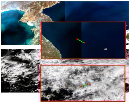 We applied RANSAC to the matching results. When we applied RANSAC based on the GOCI sensor model, all outliers were successfully removed. We can check the results in Table 3 by checking the number of inliers identified by RANSAC (“Inlier”) and the number of outliers within the inliers (“Outlier”). We used the inliers as GCPs for precise sensor modeling. Figure 13 shows an example of shoreline matching after RANSAC.