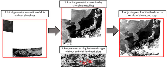 The overall image mosaicking process is shown in Figure 8. Initial geometric correction is performed on slots without shorelines. Next, precise geometric correction is performed on slots with shorelines through shoreline matching. Frequency matching is performed between a slot without shorelines and an adjacent slot with shorelines. Lastly, the shift obtained from frequency matching is applied to the initial geometric correction result.