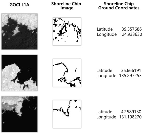 To perform shoreline matching, we constructed a shoreline chip database. We used the Global Self-consistent, Hierarchical, High-resolution Geography (GSHHG) database as raw data in the shoreline chip database [15]. The GSHHG database was constructed from three public domain shoreline databases: World Data Bank II (WDB II), World Vector Shoreline (WVS), and Atlas of the Cryosphere (AC) [16]. We projected the GSHHG database using the GOCI ephemeris to acquire shoreline images that match the GOCI images and constructed the shoreline chip database by extracting small-image chips centered on dominant shorelines. We had analyzed the matching success rate according to specifications of the shoreline chip database. Based on the result, we constructed a shoreline chip database of images with an 81 × 81 pixel size, 1.5 km thickness, and 0.55 km spatial resolution [17]. As shown in Table 1, we constructed a total of 451 shoreline chips. In slots 0 and 1, a relatively small number of shoreline chips were constructed because there was less shoreline within those slots. Figure 10 shows examples of shoreline chips constructed and corresponding to GOCI slots.
