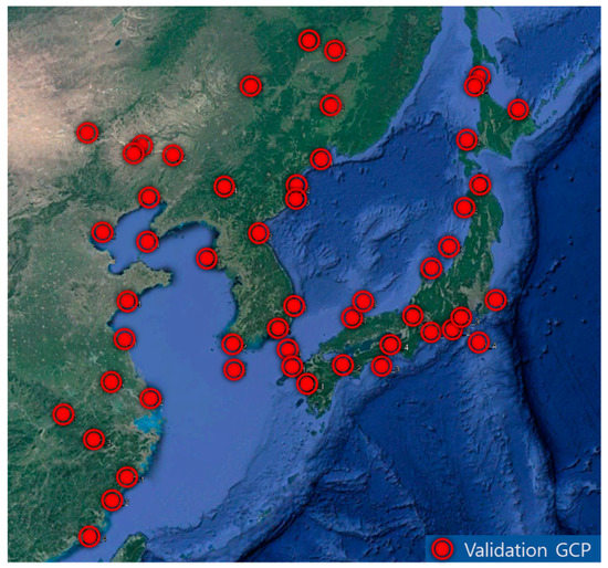 In order to validate the quality of the geometric correction, we generated 52 validation GCPs by measuring precision ground coordinates using Google Maps. The GCPs were extracted so as to be distributed evenly on each slot. Validation GCPs were extracted by averaging measurements four times per slot, except for slots 12, 13, and 14. Figure 11 shows the distribution of the GCPs, and Figure 12 shows examples of the GCPs and the corresponding parts of the GOCI slots. The accuracy of Google Earth images is expected to have a horizontal error of about 1.8 m to 3.63 m and a vertical error of 1.73 m, on average [18]. Since the spatial resolution of GOCI is 500 m, it is possible to verify the geometric correction results through validation GCPs acquired through Google Earth.