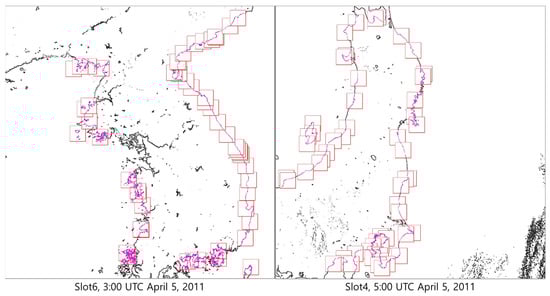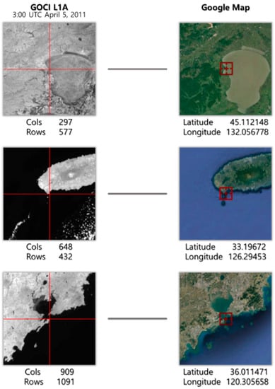 As shown in Table 4, the average root mean square error (RMSE) was 1.1 km in eight datasets. In slots 0 and 1, the geometric correction quality was worse than other slots, because the GCP number from shoreline matching was not sufficient.