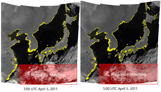 Table 6 shows the accuracy of geometric correction with shifts obtained as a result of frequency matching. It shows approximately 1.5 km errors for all slots, which is close to the error with shoreline matching. However, due to the outliers in frequency matching, the accuracy of the slots with outliers was large as underlined in Table 6. When the outliers were removed, the accuracy of these slots was improved greatly and the average RMSE for all slots was improved to 1.2 km, as shown in Table 7.