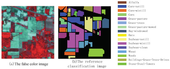 To verify the performance of ROF-KELM algorithm, we did an experiment using hyperspectral remote sensing data called AVIRIS obtained from the airborne visible infrared imaging spectroradiometer of NASA. It is from an Indian Pines forest test site in northwestern Indiana, USA. The image contains pixels, with 200 spectral bands (104–108, 150–163, and 220). The spatial resolution is 20 m/pixel. The classification data of AVIRIS is shown in Table 1. The schematic diagram of AVIRIS image is shown in Figure 3.