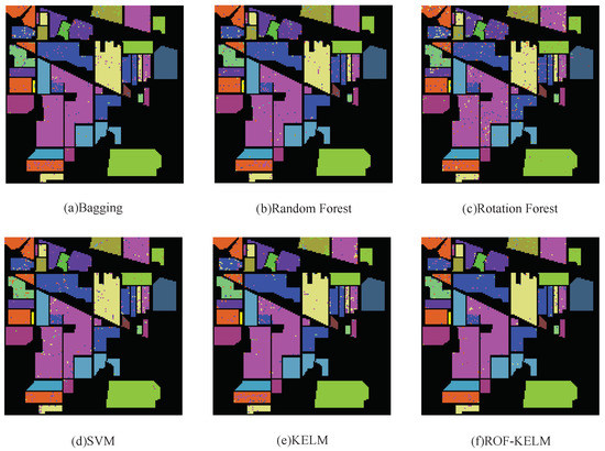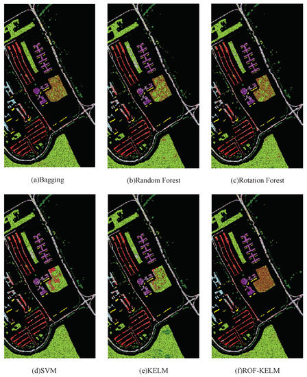 In these experiments, the classification accuracies for the proposed algorithm are obtained and evaluated as shown in Table 2. The overall classification accuracy(OA) is the ratio of the number of pixel categories to the total number of categories. The Kappa coefficient (Kappa) is the ratio of error reduction produced by classification and completely random classification. The value of OA and Kappa from the proposed ROF-KELM algorithm have reached 0.9457 and 0.9322, better than the comparing algorithms of Bagging [36], Random Forest [37], Rotation Forest [13], SVM [22] and KELM [16]. Similarly, the high overall classification accuracy indicates that the algorithm has good effects in classifying AVIRIS images, and the high Kappa coefficient indicates good stability of the algorithm. Therefore, the proposed ROF-KELM algorithm performs well in the classification processing of AVIRIS images.