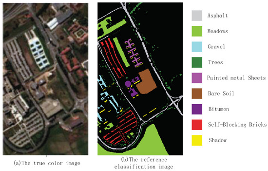 The second hyperspectral remote sensing image is about the University of Pavia remote sensed by Reflective Optices System Imaging Spectrometer(ROSIS). It exists 115 spectral bands across 0.43 to 0.86 m spectral range in the original hyperspectral remote sensing image. After preprocessing, 12 bad bands are removed and 103 bands are remained in this simulation. The University of Pavia image consists of pixels and the spatial resolution of is 1.3 m per pixel. There are 9 ground-truth classes in the University of Pavia image, and 42776 samples are labeled. The details of the University of Pavia image labeled samples are shown in Table 3. From Table 3, There are about more than 1000 samples for every class of the University of Pavia image. The schematic diagram of ROSIS image is shown in Figure 5.
