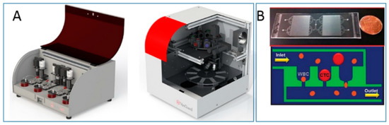 The “Celsee” system, able to process blood samples and perform image analysis (A). Microfluidic setup and scheme of the mechanism of CTCs capturing with inlet and outlet for pumping blood samples and reagents through the device (B). Modified with permission from [59].