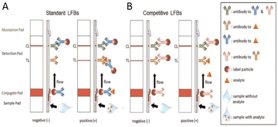 Scheme of a lateral flow test across with (A) standard and (B) competitive immunoassay. In the standard assay, when the sample is added the liquid start flowing to the conjugate pad where the analytes, if present on the sample, can bind to the label particles. The conjugate can flow by capillarity forces across the detection pad where they are captured only if the conjugate has the analytes attached. Instead, in competitive model the analyte and the label particles compete for being captured on the detection pad obtaining a response inversely proportional to the concentration of analytes. Reproduced with permission from ref. [63].
