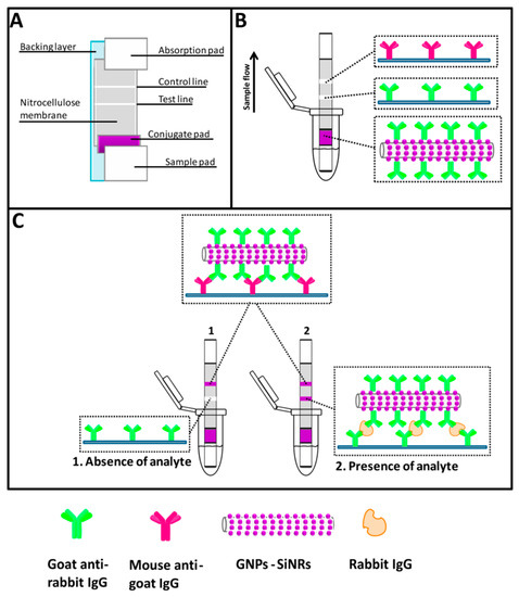 Lateral-flow strip biosensor described by Xu et al. (A) scheme of the device, (B) position of immobilized reagent on the strip and (C) measurement principle of the lateral-flow strip biosensor based on gold-nanoparticle-decorated silica nanorod (GNPSiNR) label in the presence and absence of rabbit IgG. Modified with permission from [68].