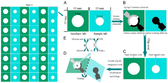 Schematic representation of the 3D origami device and assay procedure. Wax pattern of paper sheet (sheet-A) and (A) Single 3D origami device without the screen-printed electrodes. (B,C) Then electrodes were screen-printed on sheet-A and cut into individual 3D origami device. (D) After modification, the device was used to detect PSA exploiting an enzymatic reaction (E). Reproduced with permission from [76].